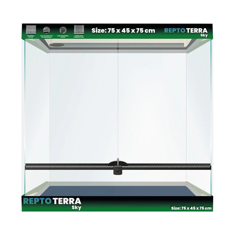Il Repto Terra Sky 75×45×75 cm è un terrario ampio e versatile progettato per offrire un ambiente naturale, sicuro e funzionale per rettili, anfibi e altri animali terricoli. Grazie alla sua altezza maggiore rispetto alle versioni più piccole, è ottimo per specie arboricole o che necessitano di spazio per arrampicarsi e per creare un layout con piante, rami e strutture verticali.