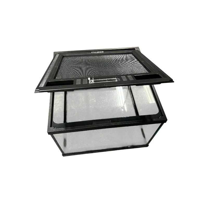 È costruito con vetro trasparente e un pannello superiore in plastica con griglia e sistema di chiusura a “click”, che include anche una piccola finestra di alimentazione integrata, permettendo di dare cibo senza aprire completamente il terrario.