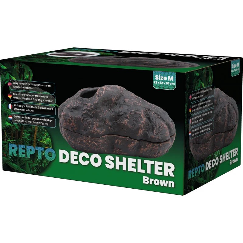 Il Repto Deco Shelter Marrone M è una tana decorativa per terrari progettata per offrire un ambiente sicuro e protetto a rettili e anfibi di media taglia. Realizzato in resina resistente e atossica, riproduce fedelmente l’aspetto di una roccia naturale, integrandosi perfettamente sia in allestimenti desertici che tropicali.